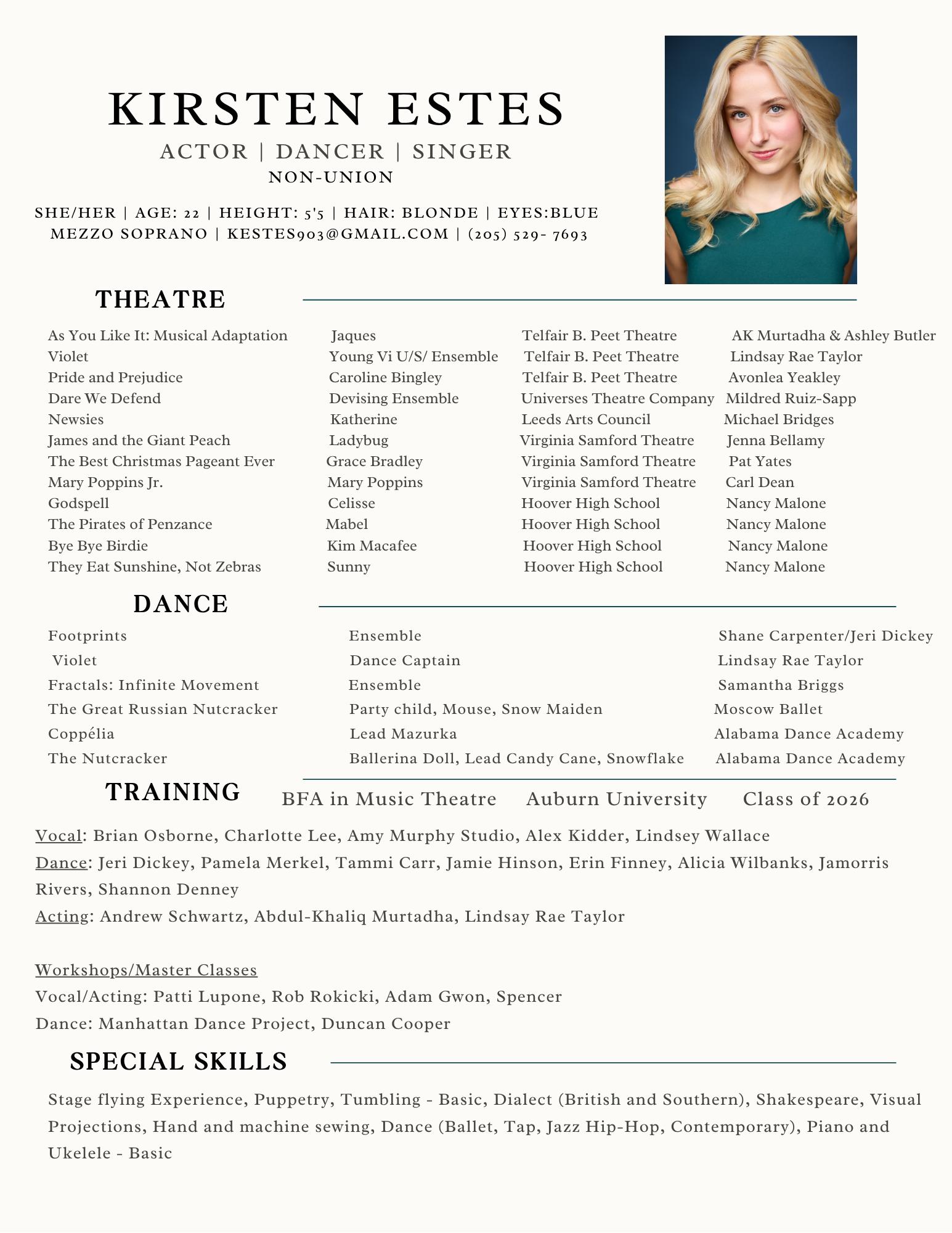 Originally trained as a dancer, Kirsten has worked in all types of dance since the age of 3. She trained with Alabama Dance Academy, Studio 1, Dale Serrano Dance Studio, and The Pointe Dance Arts over a span of 13 years. She started diving into theater when she was 8 years old and played Patch in 101 Dalmations Kids at the Alys Stephens Center. Since then, she has worked with theatre companies such as Virginia Samford Theatre, Hoover High School Theatre, Leeds Arts Council, and Auburn University Theatre and Dance. Some of her favorite past credits include Jaques in As You Like It, Mary Poppins in Mary Poppins, Katherine in Newsies, and Mabel in The Pirates of Penzance.